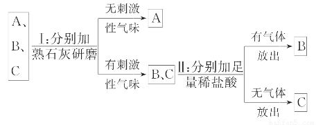 实验室有三瓶化肥未贴标签,只知道它们分别是碳酸氢铵(NH4HCO3)、氯化铵(NH4Cl)和尿素[CO(NH2)2]中的一种。为鉴别三种化肥,某同学分别取少量样品编号为A、B、C,并进行如下实验(此处箭头表示得出实验结论):