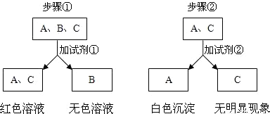 现有盐酸、氢氧化钠、氢氧化钙三瓶遗失标签的溶液,为了鉴别这些溶液,将它们编号为A、B、C,并按如图步骤进行实验,观察到以下现象: