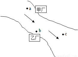 甲、乙两化工厂分布如图所示.箭头代表水流方向.如果在a处取得水样经检测只有少量OH
