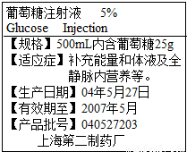 医生给病人输液时,常用葡萄糖注射液.如图为葡萄糖注射液的部分标签图,根据右图回答下列问题: