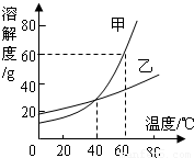 D.60℃时,将等质量的甲乙两种物质的饱和溶液降温到20℃,析出晶体较多的是乙