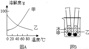 甲、乙两种固体纯净物的溶解度曲线如图1所示.在常温下,先在两支试管里分别装入甲、乙两种物质的饱和溶液(试管底部均有未溶解的固体),再放进盛有冰水的烧杯里(图2).下列说法正确的是( )