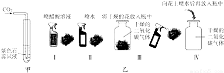 通过实验探究的方法对未知事物进行探索是化学学习的一种重要方式.为了探究二氧化碳能与水发生反应生成具有酸性的物质,A、B两同学分别设计了探究实验的方案.A同学的实验方案是将二氧化碳通入紫色石蕊试液中,观察溶液的颜色变化,如图甲所示.B同学的实验方案是取四朵用石蕊试液染成紫色的干燥的小花,按图
