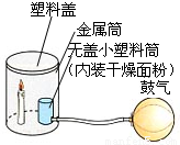 下图是模拟粉尘爆炸的一个实验,在无盖小塑料筒里放入干燥面粉,点燃蜡烛,用塑料盖盖住金属筒,迅速鼓入大量空气,不久,便会听到“砰”的一声,爆炸的气浪将金属筒的塑料盖掀起.试问: