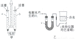 (4)科学家还用点燃氢气,通过证明燃烧产物的方法,证实了水的组成.电解水产生的氢气中会混有水蒸气,首先将其缓缓地通过装有足量无水硫酸铜的仪器c,在导管口d处点燃,然后把盛有冷水的烧杯置于如图乙所示的位置.实验过程中可以观察到的现象是