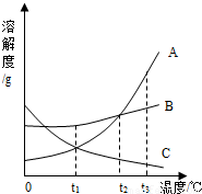 (4)温度为t℃时,三种物质的溶解度关系满足“C<A<B”的条件,则t的取值范围是