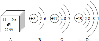 图A是钠元素在元素周期周期表中的信息,B、C、D分别是三种元素的原子结构示意图,根据题中信息回答下列问题: