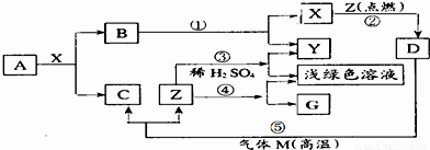 有关物质的转化关系如下图所示,其中A为一种生活中常见的气体燃料,在通常情况下,X、Y为两种气态单质,Z、G为常见金属,G为红色.B、C、D为三种常温下状态各不相同的氧化物(个别反应的条件未注明).