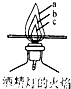 如图,灯焰处a为______,b为______,c为______.把一根火柴梗横放在酒精灯的火焰中,1-2秒后取出,观察到火柴梗在______处(填a、b、c)的部分最先碳化(变黑),说明______.试解释家用煤气炉上都有一个高低适宜的放锅三角架?______.