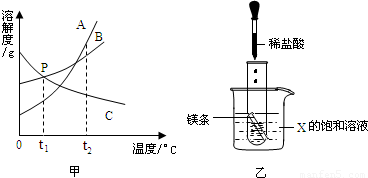(4)如乙图所示,20℃时,把试管放入盛有X的饱和溶液的烧杯中,在试管中加入几小段镁条,再加入5mL稀盐酸,立即产生大量的气泡,同时烧杯中出现浑浊,则X可能为A、B、C三种固体物质中的哪一种?______.