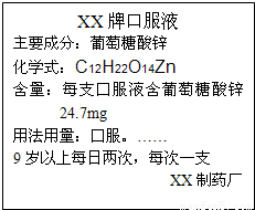 锌是人体健康所必需的元素,葡萄糖酸锌是一种常用的补锌剂.如图是某品牌葡萄糖酸锌口服液的标签.请根据标签信息回答问题: