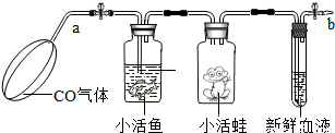 某校化学课外活动小组的同学设计了一套能验证一氧化碳性质并带有一定趣味性的实验,效果明显.实验装置如图所示:当打开开关a(同时在尖嘴处放一火源),通入适量的一氧化碳后,关闭开关a和b,并撤掉火源.约10-15分钟后,可观察到A中鱼仍活着,B中蛙死亡,C中鲜红的血液变成黑色.然后打开开关b,同时再在尖嘴导管处(开关b后)点燃.试回答: