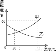D.t℃乙物质的饱和溶液降到20℃时,溶液中溶质质量分数不变