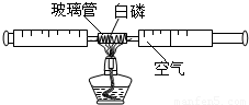 在测定空气中氧气含量的实验中,小强采用了右图所示装置:在由两个注射器组成的密闭系统中留有25mL空气,给装有白磷的玻璃管微热,待打白磷开始燃烧后缓慢推动两个注射器活塞,直至反应停止,冷却至室温,将气体全部推至一个注射器内,观察密闭系统内空气体积变化.