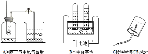 A、B、C都是研究物质组成的实验.从研究方法得知,A实验是利用可燃物消耗瓶内的______,使瓶内压强减小来推测空气里氧气含量的.B实验是通过证明生成物中所含的______来推断水的组成的.而C实验与______(填实验代号)实验的方法相同.