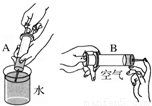 请你用微粒的观点解释以下现象.如右图所示,两支医用注射器,分别吸入等体积的空气和水,用手指顶住末端注射孔,栓塞慢慢推入,
