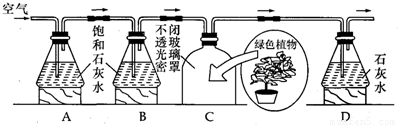 | ①将各装置按上图 所示连接好并装入化学试剂. C中放入绿色植物 | ①A装置的作用是______ ②B装置的作用是______ ③C处玻璃罩不能透光的原因是______ |