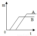 现有A、B两种质量相等的固体,其中A为纯净的氯酸钾,B是氯酸钾和少量二氧化锰的混合物.将A、B分别放入试管中,并在两个酒精灯上同时加热制取氧气.当A、B均完全反应后,如下图所示,得到的氧气的质量m与时间t的关系图象中,正确的是( )