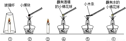 实验用品:酒精灯、蜡烛、玻璃杯、镊子、水、酒精、小木条、煤块、棉花球等.