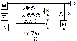 右图是初中化学中常见物质间的转化关系,其中甲、乙为气态单质,丙为固态单质;A、B、C均为氧化物,常温下B为液态.化合物D的水溶液呈浅绿色.
