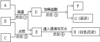 如图是一定条件下相关物质的转化关系,其中A是红色金属粉末,常用来冶炼目前世界上产量最高的金属;B气体含有两种元素,有毒;C、E是空气组成成分.