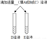 | 步骤三 | | E中无明显现象, D中的现象为 | 确定E为氯化钠溶液, 则D溶液与所加试剂发生反应的化学方程式为 |