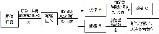 | (2)另取少量固体放于试管中,滴加足量的______. | 固体逐渐消失,有大量无色气体产生,得到浅绿色溶液. | 固体中一定含有______,一定不含Fe2O3 |