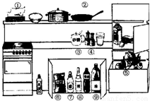 Ⅰ.①保鲜膜 ②铁锅 ③砂糖 ④食盐 ⑤蔬菜 ⑥小麦粉 ⑦食醋 ⑧白酒 ⑨植物油