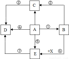 如图A、B、C、D、E是初中化学中常见的五种物质,且它们都含有一种相同的元素.其中A是胃酸的主要成分,D 为食盐的主要成分,X为金属单质,除了⑥外其他的反应均为复分解反应.