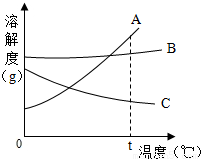 (1)t℃时A、B、C的溶解度大小顺序是