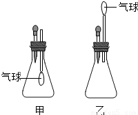 如图甲、乙两个装置均可通过胶头滴管向锥形瓶中滴加某种液体,达到使气球鼓起的目的,锥形瓶和胶头滴管中放入的物质都对应正确的是( )