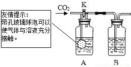 | ② | 小军选用NaOH和Ca(OH)2两种溶液分别放入上边装置中的广口瓶中,关闭K,通入二氧化碳. | A、B中均无明显变化. | B中盛放的溶液是______. 该实验目的是______ ______. |