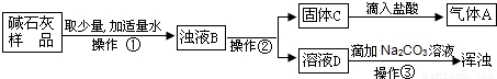 | 猜想 b | 样品中含有Na2CO3,且还含有CaO、Ca(OH)2、CaCO3中的一种 | (1) (2) | (1) ; (2)有气泡放出 | 猜想b成立 |