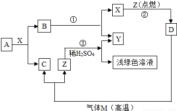有关物质的转化关系如右图所示,其中A为一常见的有机物,在通常情况下,X、Y为两种气态单质,Z为固态单质,B、C、D为三种常温下状态各不相同的氧化物(个别反应的条件未注明).
