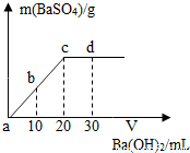 常温下,向某浓度的硫酸溶液中逐滴滴入某浓度的氢氧化钡溶液,生成沉淀的质量与加入氢氧化钡溶液的体积关系如图所示.a、b、c、d分别表示实验时不同阶段的反应结果,下列说法中正确的是( )