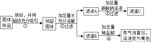 | (2)另取少量固体放于试管中,滴加足量的 . | 固体逐渐消失,有大量无色气体产生,得到浅绿色溶液. | 固体中一定含有 , 一定不含Fe2O3 |