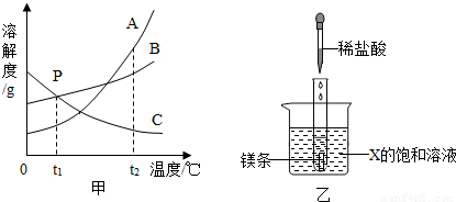 (2)如乙图所示,20℃时,把试管放入盛有X的饱和溶液的烧杯中,在试管中加入几小段镁条,再加入5mL稀盐酸,立即产生大量的气泡,同时烧杯中出现浑浊,则X可能为甲图中A、B、C三种固体物质中的哪一种?