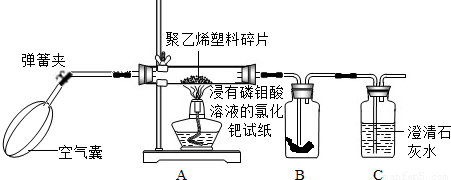| 点燃酒精灯加热,随即打开弹簧夹,通入干燥的空气.观察装置B、装置C中的现象 | 装置B中的现象是: 装置C中的现象是: | 聚乙烯塑料在空气的燃烧,生成碳的氧化物中,既有CO2,也有CO.装置C中反应的化学方程式为: |