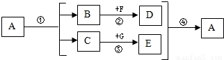 已知A是含碳化合物.下图是表示A、B、C、D、E、F、G七种常见化合物之间转化的关系图.其中:反应②为B与足量的F生成D和G;反应④为D和E生成A和F.