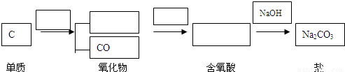 请你完成碳元素由“单质-氧化物-含氧酸-盐”的变化过程,把变化过程中相应物质的化学式填入方框中: