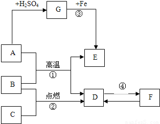 如图A~G是初中化学常见的物质,其中A为黑色固体,E为红色固体单质,B、C、D均为无色气体,F为石灰石的主要成分,G为蓝色溶液,请根据图回答下列问题: