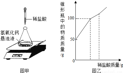 某研究性学习小组在协助老师清理实验储备室时,发现一批存放多年的氢氧化钙.为检验其变质情况,进行了如下探究:取氢氧化钙样品11.4g于锥形瓶中,加入38.6g水,振荡形成悬浊液,放在电子天平上,向锥形瓶中逐滴滴加14.6%的稀盐酸,振荡后读取质量(如图甲所示).实验测得加入稀盐酸的质量与锥形瓶中物质的质量关系如图乙所示.求:11.4g该样品中各成分的质量.