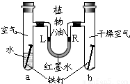 某同学设计了如图所示的装置探究铁锈蚀的条件.a管中装入少量煮沸的蒸馏水,b管中是干燥的空气.调节L端与R端的液面高度一致,塞紧木塞.一段时间后观察.下列推断错误的是( )