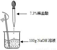 将下图所示稀盐酸滴入盛有100g氢氧化钠溶液(滴2滴酚酞试液)的烧杯中,恰好完全反应时消耗此稀盐酸的质量为50g.请回答并计算: