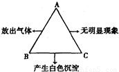 下图所示的是A、B、C三种溶液两两混合时产生的实验现象,其中A是初中化学常见的酸,请写出符合实验现象的一组物质: