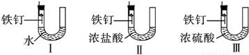 某同学为研究金属腐蚀的条件,用细尼龙线将三根大小相同的铁钉分别固定在下图所示的三个液面高度相同的装置中,放置一星期后观察现象,下列描述不正确的是( )
