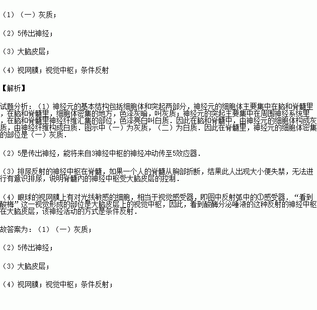 (1)在脊髓里,神经元的细胞体密集的部位是[ ] .