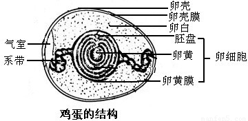故答案为:(1)卵壳;卵壳膜;气室;系带;卵黄;卵白;卵黄膜;卵黄;胚盘