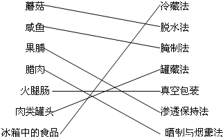 查看答案和解析>> 科目:初中生物 来源: 题型: 将下列微生物与其作用连线. (1)青霉菌 A.提取抗生素 (2)酵母菌 B.制酸奶、泡菜 (3)醋酸菌 C.酿醋 (4)乳酸菌 D.烤制面包 将食物及其相应的保鲜方法连接起来: A.蘑菇 a.冷藏法 B.咸鱼 b.脱水法 C.腊肉 c.腌制法 D.火腿肠 d.罐藏法 E.肉类罐头 e.真空包装 F.冰箱中的食品 f.晒制与烟熏法. 查看答案和解析>> 同步练习册答案 湖北省互联网违法和不良信息举报平台 | 网上有害信息举报专区 | 电信诈骗举报专区 | 涉历史虚无主义有害信息举报专区 | 涉企侵权举报专区 违法和不良信息举报电话:027-86699610 举报邮箱:58377363@163.com版权声明:本站所有文章,图片来源于网络,著作权及版权归原作者所有,转载无意侵犯版权,如有侵权,请作者速来函告知,我们将尽快处理,联系qq:3310059649。 ICP备案序号: 沪ICP备07509807号-10 鄂公网安备42018502000812号 |