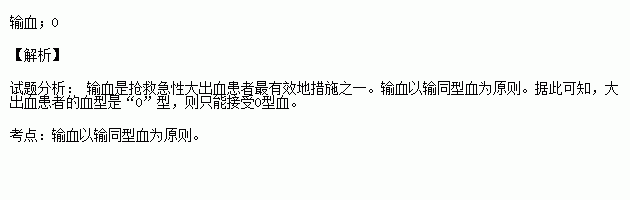 在地震灾害中,外伤性大出血病人相对较多。 是抢救急性大出血患者最有效地措施之一.如果一位急性大出血患者的血型是O型,则只能给该患者输 型血。